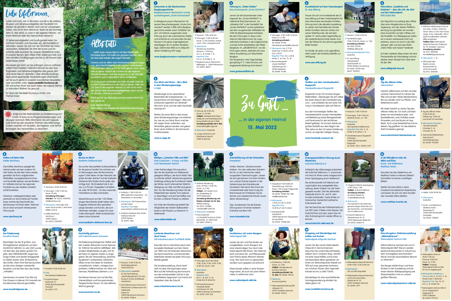 Von der Börde bis ins Höhengebiet an der belgischen Grenze stehen am diesjährigen Aktionstag eine Vielzahl an Angeboten in der Nordeifel zur Auswahl. Über 2.000 Besucher:innen werden bei gutem Wetter am 15. Mai erwartet. Als prominenter Pate unterstützt der bekennende Eifeler Stephan Brings, Mitglied der gleichnamigen Kölsch-Rockband, die Aktion.