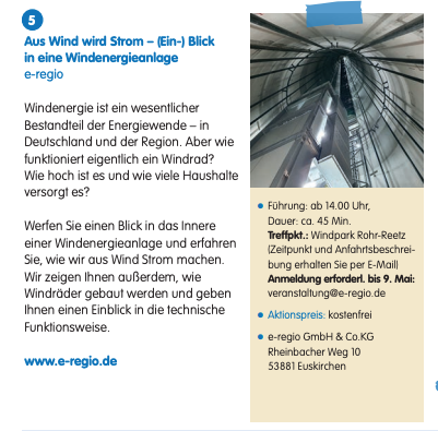 Auf dem vielfältigen und umfangreichen Programm des Aktionstages am 15. Mai stehen u.a. die Möglichkeit, einen Blick in eine Windenergieanlage im Windpark Rohr-Reetz zu werfen oder beim Tag der offenen Tür sich den Heinrichshof in Blankenheim einmal näher anzusehen.