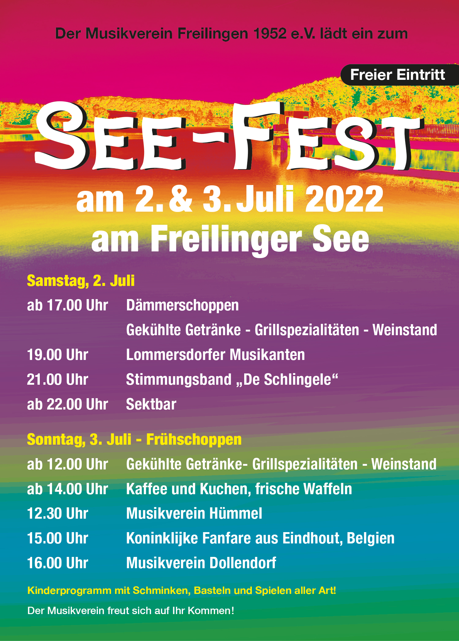 Endlich wieder...Nach zweijähriger Corona-Pause heißt es wieder “It’s See-Time”. Bereits zum 44. mal findet in diesem Jahr das beliebte Seefest statt. Bei schöner Atmosphäre und guter Musik lädt der Musikverein Freilingen in seinem Jubiläumsjahr zu einer abwechslungsreichen Zeit am See ein.