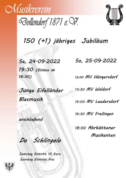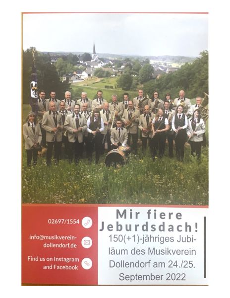 "Mir fiere Jebursdach!" - so das Motto des musikalischen Wochenendes des Musikvereins Dollendorf 1871 e.V., der am 24. und 25. September seinen 150. Geburtstag aus dem letzten Jahr mit einem musikalischen Wochenende mit jede Menge Musik und Tanz nachfeiert. Auch der Musikverein Freilingen ist mit dabei. Herzlichen Glückwunsch nachträglich und viel Spaß!