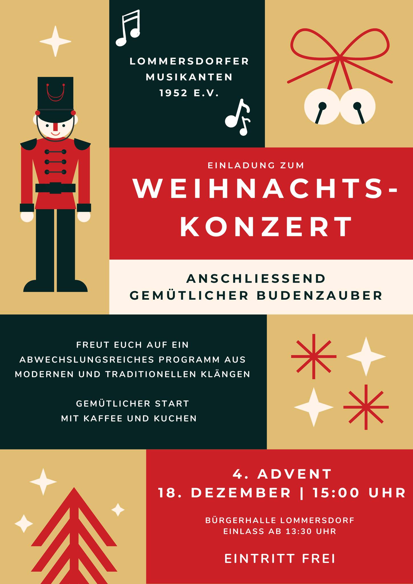 Weihnachtliche Klänge und mehr...kann man beim Weihnachtskonzert der Lommersdorfer Musikanten am 4. Adventssonntag, 18. Dezember in der Bürgerhalle Lommersdorf erleben. Nach einer schmackhaften Einstimmung mit Kaffee und Kuchen kann man ab 15.00 Uhr neben beliebten Blasmusikstücken natürlich vor allem auch bekannte moderne und traditionelle Weihnachtslieder genießen. Im Anschluss wird noch ein gemütlicher Budenzauber geboten. Der Eintritt ist frei.