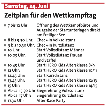 Auch Kinder und Jugendliche haben die Möglichkeit, ihre sportlichen Fähigkeiten unter Beweis zu stellen. Während die »großen Athleten« auf der Radstrecke sind, kann der Nachwuchs beim HERO Kids Swim & Run teilnehmen. Es gibt auch hier die Möglichkeit als Einzelstarter oder in der Staffel zu starten. Jeder Teilnehmer, ob Einzel- oder Staffelstarter erhält am Ende eine Medaille und kann sich vom Publikum entsprechend feiern lassen. Eine Zeitnahme bzw. Wertung erfolgt nicht. Die Anmeldung für den HERO Kids Swim & Run ist nicht online möglich, sondern kann direkt vor Ort bis 12.00 Uhr erfolgen.