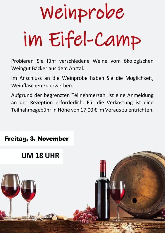"Mögen Sie Ahrwein?" - Dann sollten Sie diese ganz besondere Weinprobe auf dem Eifel-Camp nicht verpassen. Am Freitag, 3. November kann man ab 18.00 Uhr fünf verschiedene Weine des ökologischen Weingutes Bäcker aus Ahrweiler probieren. Jetzt anmelden!