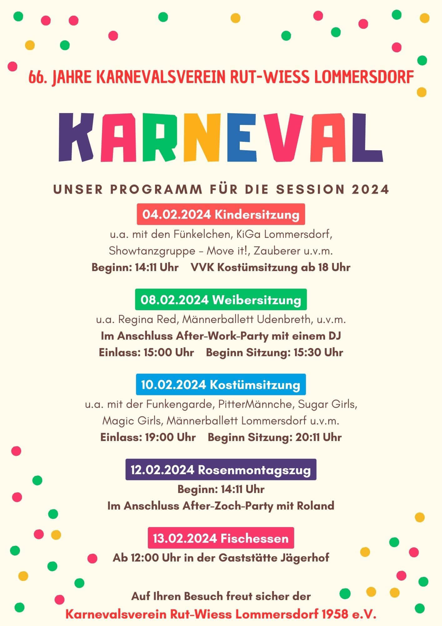 Montags, 11. Februar 2024 zieht ab 14.11 Uhr dann wie immer der Rosenmontagszug durch die Straßen von Lommersdorf. Anschließend wird in der Bürgerhalle auf der "After-Zoch-Party" wie in jedem Jahr kräftig weiter gefeiert, natürlich mit Musik und Stimmung von Roland.