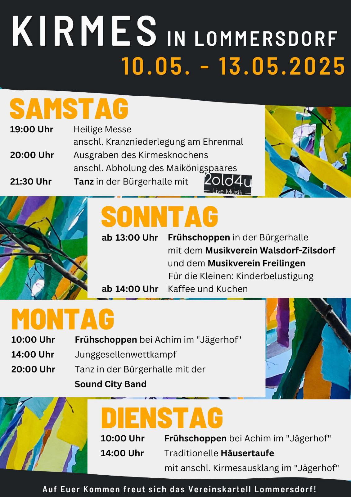 "Da sin mer up de Kirmes enjelade..." - Der Wonnemonat Mai bereitet bekanntlich die größten Glücksgefühle, nicht nur wegen der erwachenden Natur, sondern auch wegen der traditionellen Veranstaltungen, die in den nächsten Wochen endlich wieder anstehen. So kann nur eine Woche nach der Freilinger Kirmes auch im Nachbarort Lommersdorf Kirmes gefeiert werden, nämlich vom 10. bis 13. Mai 2025. Auch der Musikverein Freilingen ist wieder mit dabei...