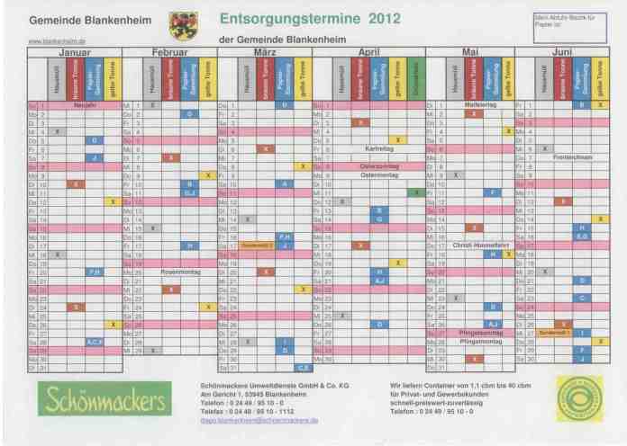 Wer versehentlich keinen erhalten hat oder gerne ein zusätzliches Exemplar haben möchte, kann die Abfuhrübersicht inclusive der Anmeldekarten für die Sperrgutabfuhr oder die Grünabfuhrsammlung auch bei der Ortsvorsteherin abholen oder sich eine Ausgabe unter folgendem Link ausdrucken: Abfallkalender 2012.
