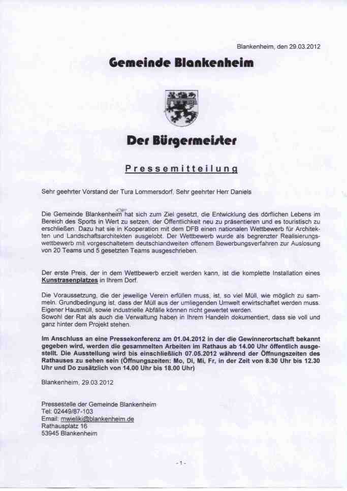 Diese Nachricht hat sowohl die Altvorstände vom 1.FC Oberahr und der TuRa Lommersdorf als auch den Vorstand der vor kurzem gegründeten SG Oberahr-Lommersdorf in höchste Verzückung versetzt : in einer heute, 1. April 2012 veröffentlichten Pressemitteilung wurde dem Vorstand der TuRa Lommersdorf eröffnet, dass sich der Verein oberhalb der L 115 als Teilnehmer eines begrenzten Realisierungswettbewerbs gute Chance auf den Gewinn des ersten Preises ausrechnen kann : die komplette Installation eines Kunstrasenplatzes.