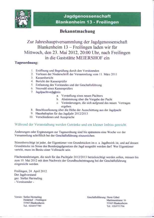 Jahreshauptversammlung der Jagdgenossenschaft Bez. 13 am 23. Mai