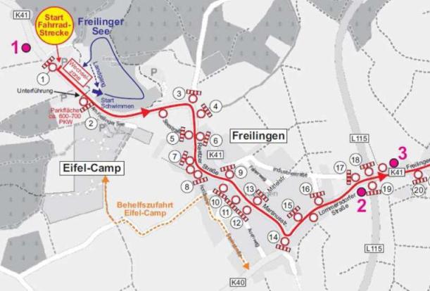 Dazu werden die Teilnehmer zunächst über die Hauptverkehrswege durch die Ortschaft Freilingen geleitet. Dann geht es über die L 115 nach Lommersdorf weiter in Richtung Nürburgring.