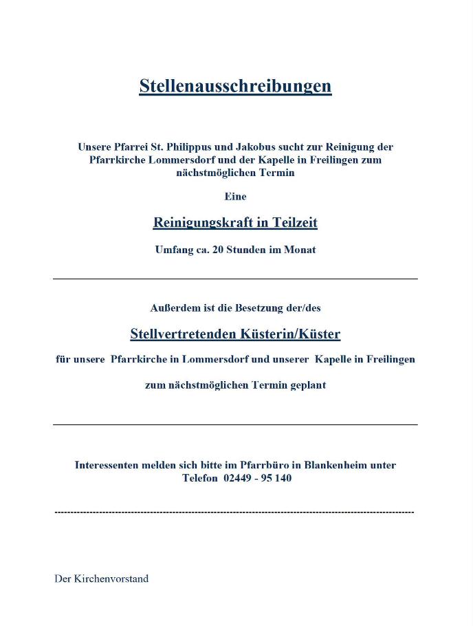 Pfarrei sucht Reinigungskraft und Stellvertretung für Küsterin