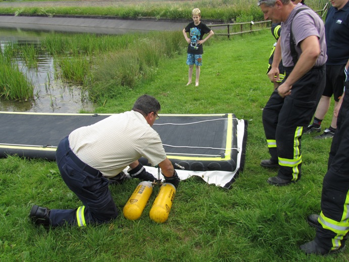 Das Geschenk an die gemeindliche Feuerwehr, das jetzt in Freilingen erstmalig auf dem Wasser eingesetzt wurde, hat eine Länge von 10 m und ist 1,40 m breit. Die Befüllung erfolgt mittels eines Füllschlauches, der direkt an eine Druckluftflasche angeschlossen wird. Rund 2200 l Luft müssen in den Steg gepresst werden, damit ein Betriebsdruck von 0,5 bar erreicht werden kann. Und dies geschieht in einer Zeit von ungefähr 30 Sekunden, wichtig für alle Rettungsfälle, in denen es manchmal auf jede Sekunde ankommt.