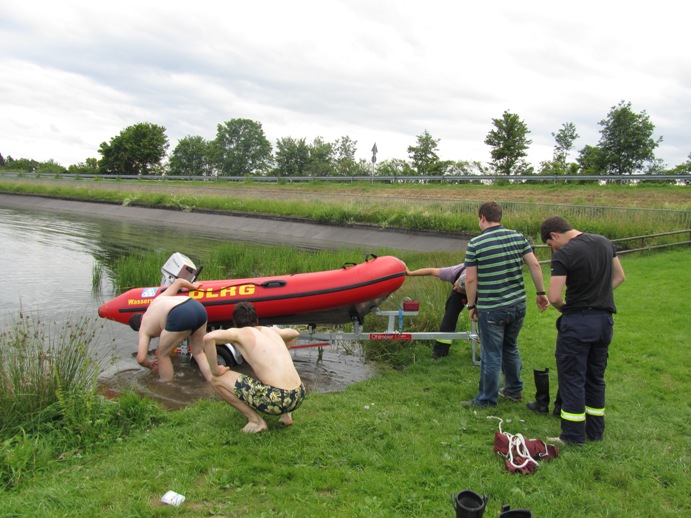 Da aber der Freilinger See kein offizieller Badesee ist und daher keine ständige Badeaufsicht der DLRG durchgeführt wird, müssen auch sommerliche Bergungsaktionen geübt sein. Dazu steht am Freilinger See ein Motorboot der DLRG zur Verfügung, das in einer Garage am Kiosk stationiert ist und ebenfalls an diesem Abend von der Feuerwehr zum Übungseinsatz gebracht wurde. Dass beide Einsatzmittel dann auch im Zusammenspiel wunderbar funktionieren, wurde anschaulich von den Feuerwehrleuten demonstriert.