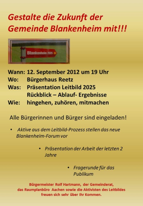 Vor fast genau 4 Jahren, am 25. August 2008 hatte der damalige Rat einstimmig die Initiierung eines Leitbildprozesses Blankenheim 2025 beschlossen. Mit der Vorbereitung, Durchführung und Begleitung des Entwicklung und Erarbeitung eines Leitbildes für unsere Gemeinde wurden damals die ARGE Prof. Rolf Westerheide und Uli Wildschütz/RAUMPlan beauftragt.