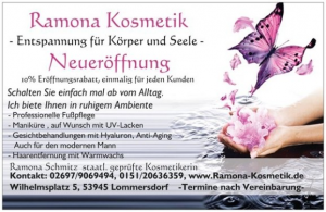Ein neues Angebot gibt es seit kurzem in Lommersdorf, das vor allem die Damenwelt interessieren wird: am Wilhelmsplatz 5 bietet Ramona Schmitz in ihrem neu eröffneten Kosmetikstudio neuerdings Entspannung für Körper und Seele an.