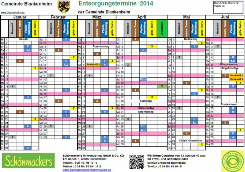 Der Entsorgungskalender und alle wichtigen Hinweise zur Abfallentsorgung können demnächst auch unter folgendem Link heruntergeladen werden: Abfallkalender Gemeinde Blankenheim bzw. sind bei der Ortsvorsteherin erhältlich.