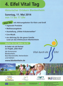 Nachdem diese regionalen Aktionstage bereits in Nettersheim, Dahlem und Bad Münstereifel auf viel Zuspruch stießen, findet der nächste "Eifel Vital Tag" am Sonntag, 11. Mai 2014 von 11.00 bis 17.00 Uhr im historischen Ortskern von Blankenheim statt.