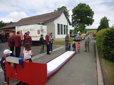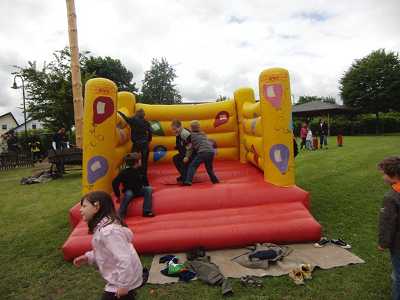 Am nächsten Tag, Sonntag, dem 20. Juni 2010 stand dann das eigentliche Kinderfest auf dem Programm. Nach einem musikalischen Frühschoppen mit dem Musikverein Hüngersdorf wurden ab 14.00 Uhr die Spiele offiziell eröffnet. Auch in diesem Jahr wurde wieder allerhand für die kleinen Gäste geboten. Neben den üblichen Spielen wie Heißer Draht, Kegelbahn, Kuhmelken usw. konnten die Kinder sich auch wieder am Minnibagger üben oder auf der Hüpfburg austoben. Neben der Jugendfeuerwehr bot auch das Deutsche Rote Kreuz wieder eine anschauliche Vorführung, bei der man sich über Rettungsmaßnahmen im Notfall informieren konnte. Natürlich ließ man auch diesmal wieder etliche Luftballons auf eine mehr oder weniger lange Reise starten. Dabei wurden dann auch die Gewinner des letztjährigen Luftballonwettbewerbs verkündet. Insgesamt waren nur 6 Karten zurück geschickt worden. Den ersten Platz belegte dabei Denise Radermacher. Ihr Ballon war im letzten Jahr eine Strecke von 325 km geflogen, während es die zweit und dritt Platzierten auf 320 km bzw. 245 km brachten.