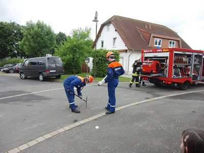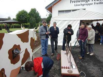 Normalerweise ist die Feuerwehr bei einem Einsatz sicherlich glücklich, wenn sie über ausreichende Wasserzufuhr verfügt und kühle Witterungsbedingungen herrschen. Beim "Aufmarsch" der Feuerwehrkameraden am 19. und 20 Juni anlässlich der Einweihung des Feuerwehrgerätehauses und des diesjährigen Kinderfestes hätte man sich aber dann doch eher die eigentlich um diese Jahreszeit zu erwartenden trockenen und sommerlichen Verhältnisse gewünscht. Nichts desto trotz ließen sich Veranstalter und Gäste an diesem Wochenende nicht von den äußeren Bedingungen beeindrucken bzw. abhalten, so dass insgesamt trotz der Schafskälte und des zeitweiligen Regens auf eine gelungene und erfolgreiche Veranstaltung zurück geblickt werden kann.