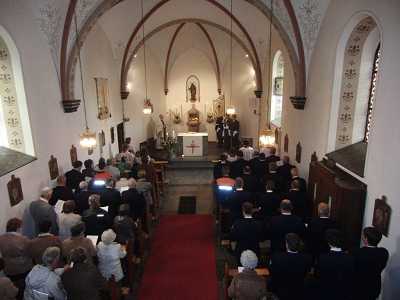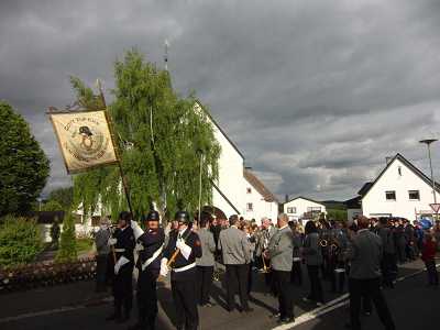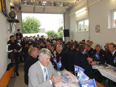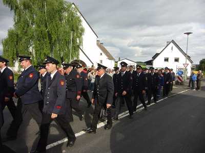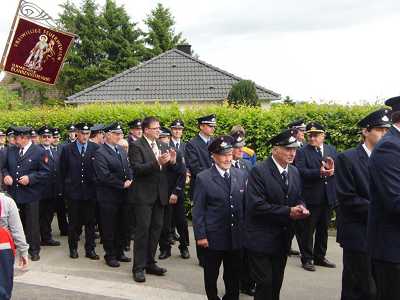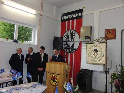 Offiziell begannen die Feierlichkeiten am Samstag, 19. Juni mit einem Festgottesdienst in der Kapelle, der von Pfarrer Meuser unter Einbeziehung der anwesenden Kinder ganz auf die Feuerwehr als Freund und Helfer zugeschnitten gestaltet wurde. Anschließend begab sich der Festzug unter Mitwirkung des Musikvereins Freilingen zum neuen Feuerwehrgerätehaus. Dort wurden zunächst vom Löschgruppenführer Siegfried Bonzelet die zahlreich erschienenen Gäste und Abordnungen der anderen Löschzüge der Gemeinde Blankenheim begrüßt. In seiner Ansprache wies er darauf hin, dass nach dem Brand des alten Feuerwehrhauses im April 2007 insgesamt 3518 Stunden von Feuerwehrleuten aber auch etlichen Freiwilligen aus der Dorfgemeinschaft in den Neubau des Feuerwehrgerätehauses investiert worden seien. Somit wurden rund 90 % der Arbeiten in Eigenleistung erbracht. Von diesem Arbeitseinsatz zeigte sich auch Bürgermeister Rolf Hartmann begeistert und führte aus, dass ein Durchschnittsbeamter dafür über 1 1/2 Jahre arbeiten gehen müsse und dabei nicht so ein Ergebnis erzielt würde. Er verwies zudem darauf, dass die Gemeinde letztlich nur 120.000 € Materialkosten beisteuern musste, um dieses beeindruckende Feuerwehrgerätehaus zu errichten. Nach weiteren Ansprachen von Gemeindewehrleiter Willi Heck, dem stellvertretenden Kreisbrandmeisters Walter Wolff und der Ortsvorsteherin Simone Böhm wurde dann die Einsegnung von Herrn Pfarrer Meuser vorgenommen, der hervorhob, dass die Feuerwehr zurecht stolz auf ihre Leistung sein könne.
