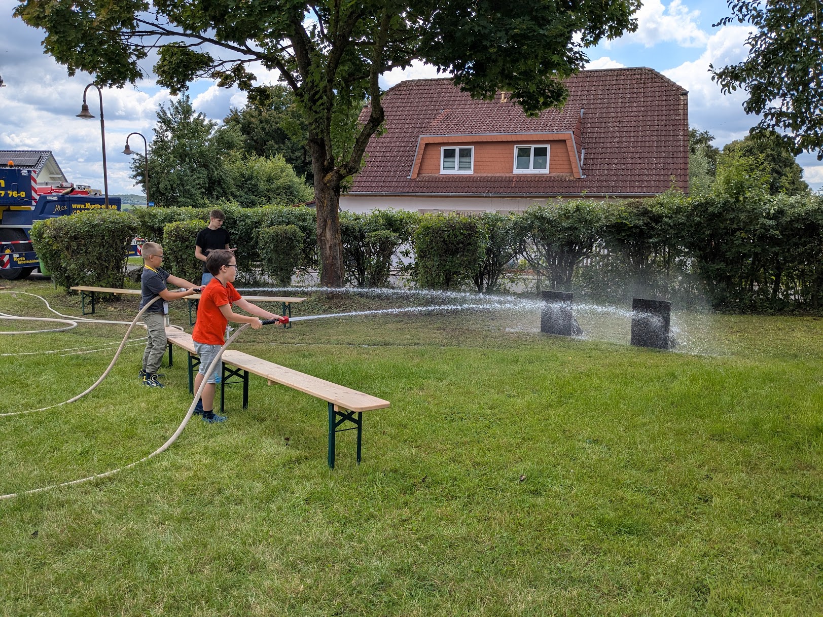Zum einen floss reichlich Wasser aus den ausgelegten Feuerwehrschläuchen, mit denen sich der Nachwuchs beim Zielspritzen übte.