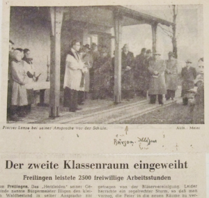 Jeder Menge Politprominenz war damals vertreten, neben Bürgermeister Illingen u.a. auch noch Oberregierungsrat Hilgers, Oberkreisdirektor Dr. Gerhardus, Schulrat Blom und der Landtagsabgeordnete Schwering. Und vor allem der Oberkreisdirektor sprach in seiner Rede der Gemeinschaftsleistung der Freilinger, die nicht nur beim Schulbau, sondern auch bei allen anderen öffentlichen Belangen zum Ausdruck komme, ein großes, öffentliches Lob aus.